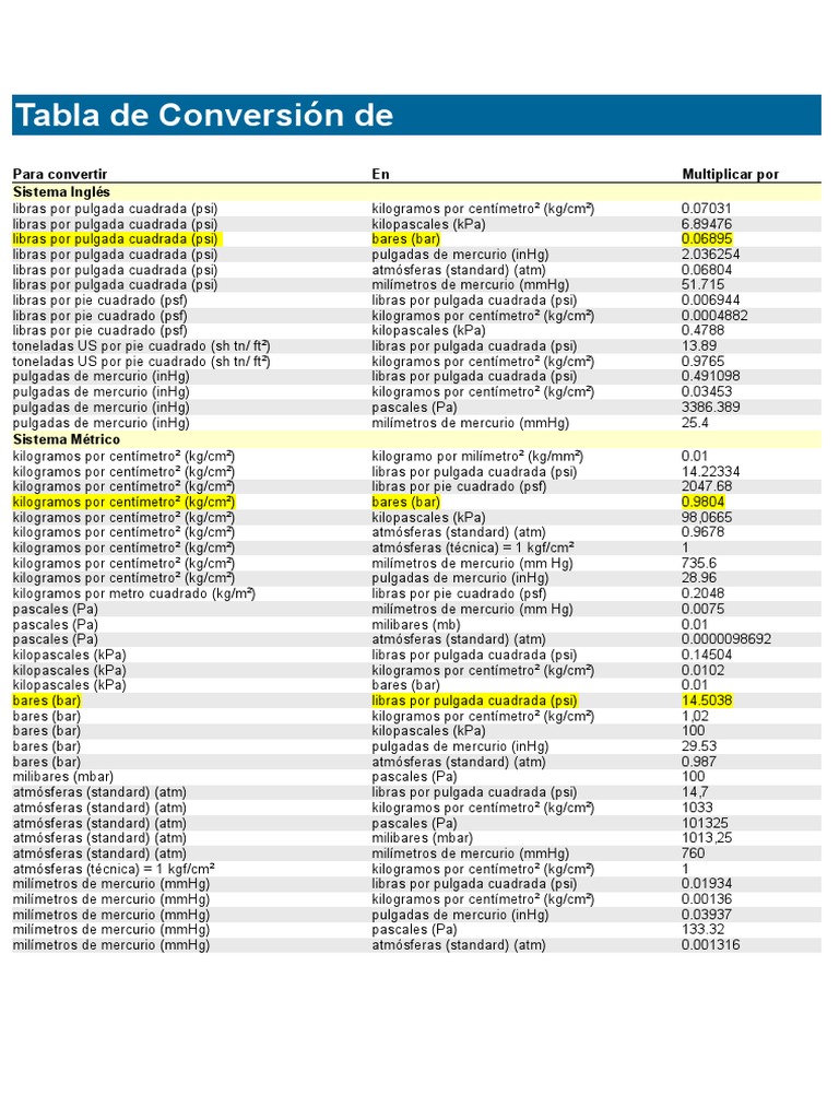 Tabla De Conversion De Presiones Pascal Unidad Kilogramo